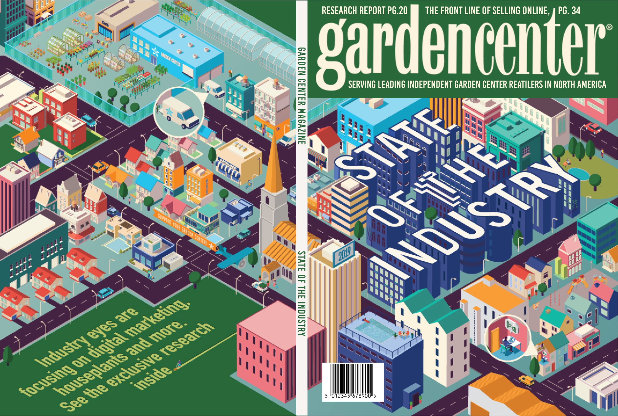 Garden Center magazine are a small American publication but they had big ideas for their annual State of the Industry Issue. They wanted to examine the place that garden centers had in communities and how internet shopping was enhancing a gardens centers influence in residential areas. They commissioned me to design a spread that would be on both covers. I used their themes to create an isometric town complete with garden center which made for a fun and distinctive issue. The design won a national silver award for the American Society of business publication editors.