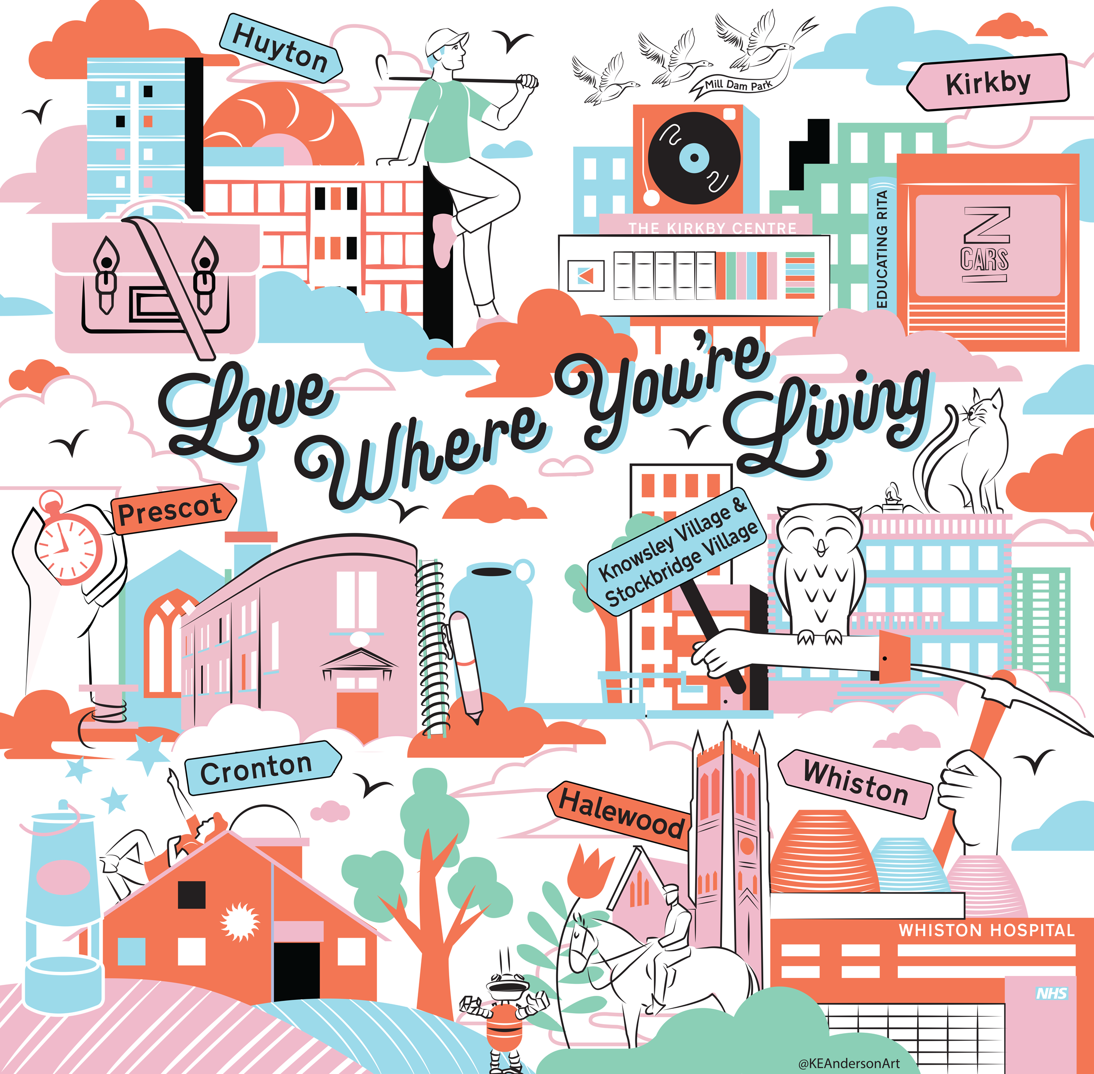 Prescot Museum is undergoing an exciting regeneration and wanted something that would sit in the window while the work was going on. I know that Knowsley can be portrayed as a boring place and very deprived but I, as someone who loves it as a borough, wanted to celebrate the amazing heritage and creativity there. I made something joyful that could later be used as merchandise.